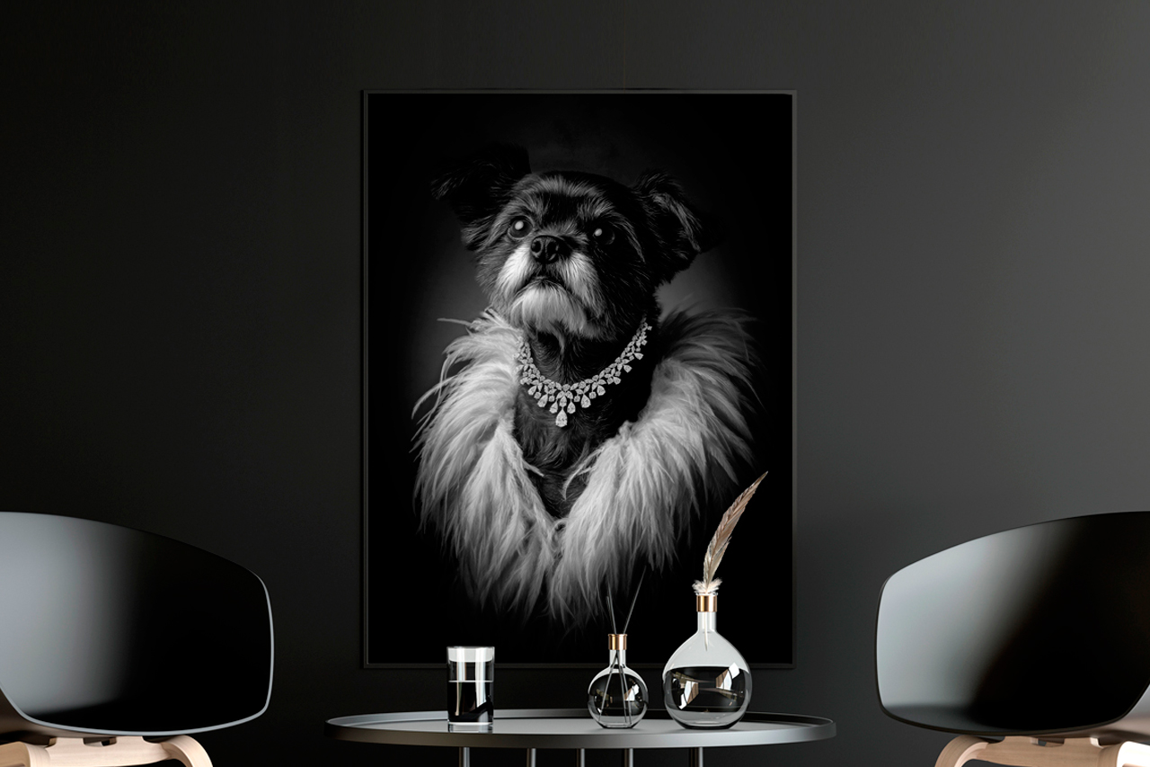 Votre animal est unique, son portrait aussi. Vous contrôlez tous les éléments du portrait : costume, décor, couleurs et nuances.